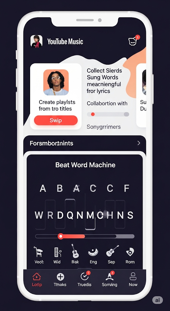 Nr. 52 Excalibur Nr. 1 Swip Knopf in youtube music integrieren, ein Klick auf dem Knopf erstellt die Playlist in einer Geschichte die in den Namen der jeweiligen Titel des Songs geschrieben wurde Nr. 2 Während ein Lied läuft wird ein Wort oder 3 Wörter gesungen, die im Hintergrund gespeichert werden wenn man auf Swip+ drückt. Hört man mehrere Lieder und speichert an einer Variablen Songstelle weiter diese Wörter, verknüpft der Swip Algorithmus diese zu einem Satz zusammen. Nr. 3 Hat man einen Satz zusammen geswipt, wird ein neuer Versuch gestartet, um einen 2 Satz zu kreieren. Hat man 5 Sätze zusammen, so bekommt man einen Absatz, den man einen Songwriter zusenden kann der daraus die Geschichte weiterführen könnte. Der Songwriter oder nächste User kann einen neuen swip machen und einen passenden Absatz dazu gestalten Nr. 4 Swipkiss bietet die Möglichkeit einen beat der geswipten Geschichte zu erstellen, das funktioniert indem man ein Wort der Geschichte sich passend dazu auswählt. Wir nehmen zum Beispiel, das Wort „reputation“. Nr. 5 Der Buchstabe R wird in Vectorpunkte unterteilt, das heisst ein Punkt erhält eine Instrumenten Fähigkeit. Touchen Sie die kleinen Kreise, Vectorpunkte mit soft, medium, hard Druck an und ziehen Sie Diese aus oder zueinander. Der Druck auf die Punkte ergibt ein Sound zum Beispiel, oberer Punkt - Gitarre, unterer Punkt - Piano, mittlerer Punkt - Bass diagonaler Punkt - Flöte und so weiter Nr. 6 Das Wort Reputation in diesem Fall hat also 10 Buchstaben, also können damit 10 Sound Ebenen erstellt werden, die dann zueinander passend kreativ verbunden werden um den Beat zu erstellen. Nr. 7 Die Beat Word Maschine kann an einem DJ Pullt integriert werden und viele Emotionen hervorrufen können.
