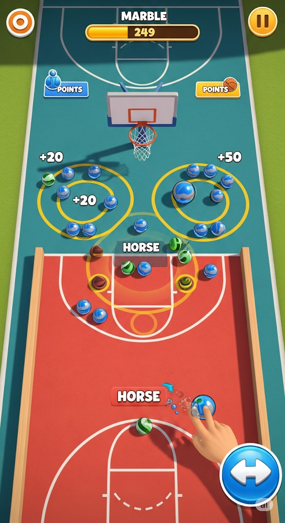 Nr. 53 Marblemount Nr. 1 Es werden Murmeln in die Mitte eines Kreises gelegt, gehen wir davon aus, das jeder Spieler 4 Murmeln in die Mitte des Kreise leg, also 8 zusammen Nr. 2 Zusammen haben wird dann 8 Murmeln Nr. 3 Versuchen Sie diese Murmeln aus der Kreis Mitte aus dem Feld zu schupsen bzw. Wegzuklickern Nr. 4 Wenn Sie eine Murmel aus dem Feld mit einer größeren Murmel befördert haben, so können Sie diese Behalten Nr. 5 Das Feld des Spiel ähnelt einen Basketballballplatz, also versuchen Sie die Murmeln aus der Mitte nach außen zu befördern Nr. 6 Falls Sie den ersten Stoß nicht schaffen, und die Murmeln sich auf dem Feld befinden, wird der Platz gemerkt und Sie müssen nun, als Basketball Spieler von diesem Feld, wo sich die Kugel befindet, die Murmel in den Murmel Korb treffen, wenn Sie noch treffen, dann bleibt die Kugel dort stehen, wo sie landet Nr. 7 Wiederum fällt die Murmel durch den Korb und platziert sich wieder in die Mitte des Feldes Nr. 8 Letztendlich haben Sie eine Schleife im Spiel und müssen es wieder schaffen die Murmel komplett aus dem Feld zu entfernen Nr. 9 Wird ein Fehlwurf gemacht, dann erhalten Sie ein Buchstaben, nämlich H, versuchen Sie Horse nicht zu bekommen, sonst müssen Sie 3 Murmeln als Strafe Ihrem Gegner übergeben Nr. 10 Das Feld besteht aus mehreren Kreisen, falls eine Murmel ein Kreis überschreitet, bekommen Sie Punkte, die als Vorgabe zu erreichen sind, in unserem Fall 300 Punkte.